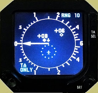 En el segundo panel, el de abajo, lo que tienes es un tipo de EHSI que incorpora info del TCAS pero no alcanzo a divisar la marca que lo muestra como on o off o el modo. En el cessna citation por ejemplo, la señal del TCAS la muestra en la esquina inferior derecha y dice por ejemplo lo mismo que el de arriba "TA Only" que es el modo de estado. Sin embargo el panel de abajo muestra mucho más. Muestra por ejemplo distancia a la radio ayuda sintonizada (PAS) que es 44nm (millas nauticas), el rumbo de 108°, la distancia al sgte way point en lo que sería una aproximación ILS y muestra la ruta para interceptarlo. Arriba a la izquierda la Ground speed (GS).