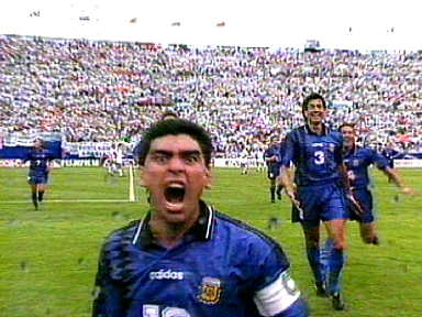 Hay un video muy bueno, de Maradona entrenando al arquero en el mundial anterior, patea algo asi como 10 pelotas, de las cuales, no sé, 7 u 8 fueron al ángulo. Hay otro que en pleno partido, cae una pelota de la mierda arriba, y le mete un taco impresionante, y con terno y zapatos.